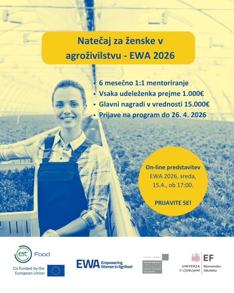 EIT Food v sodelovanju s Centrom poslovne odličnosti Ekonomske fakultete Univerze v Ljubljani že tretjič v Sloveniji izvaja program EWA – Empowering Women in Agrifood. Cilj programa je opolnomočiti ženske v agroživilskem sektorju, odpraviti vrzel med spoloma in podpreti inovativne podjetniške ideje. Kaj ponuja program EWA? Brezplačno udeležbo, vsaka od 10 izbranih udeleženk za sodelovanje prejme 1.000 EUR, […]