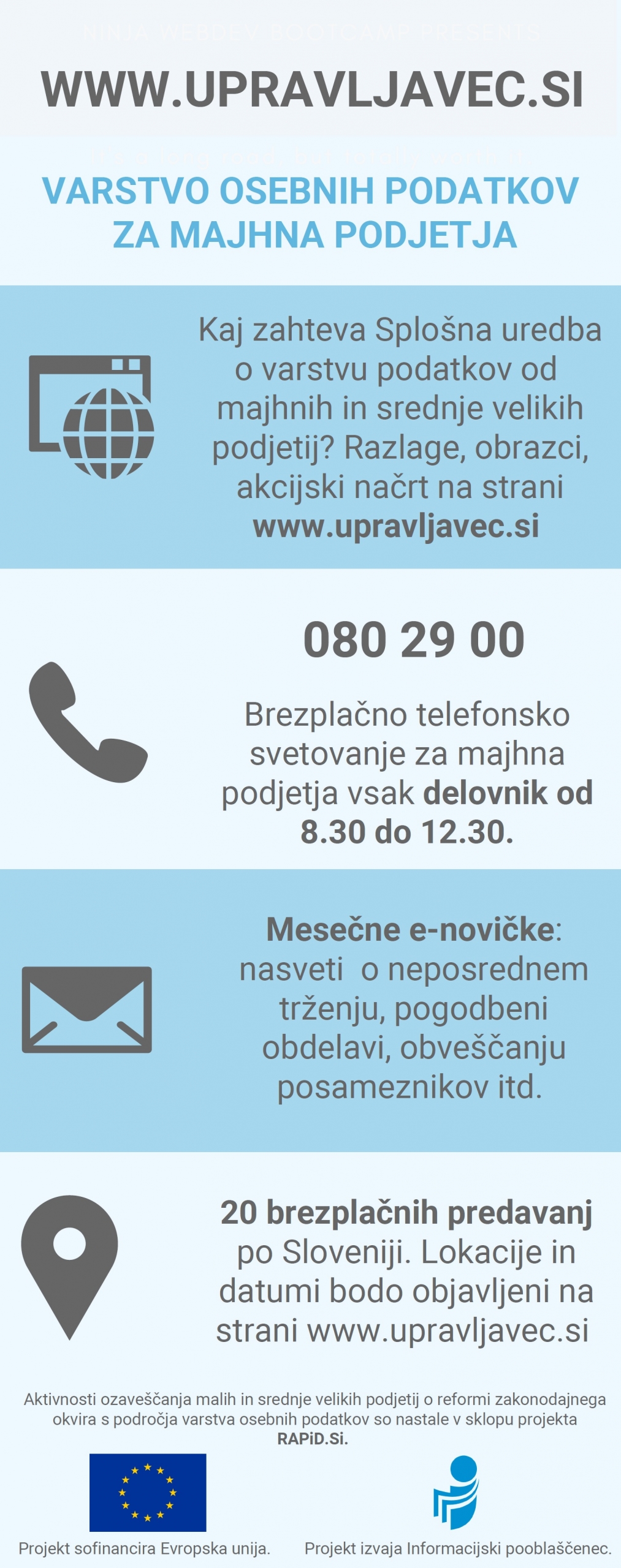 V naslednjih dveh letih bo Informacijski pooblaščenec v sodelovanju z Obrtno-podjetniško zbornico Slovenije in Gospodarsko zbornico Slovenije izvedel tudi 20 brezplačnih predavanj v osmih mestih po Sloveniji, vse lokacije in datumi pa bodo sproti objavljeni na spletni strani www.upravljavec.si.