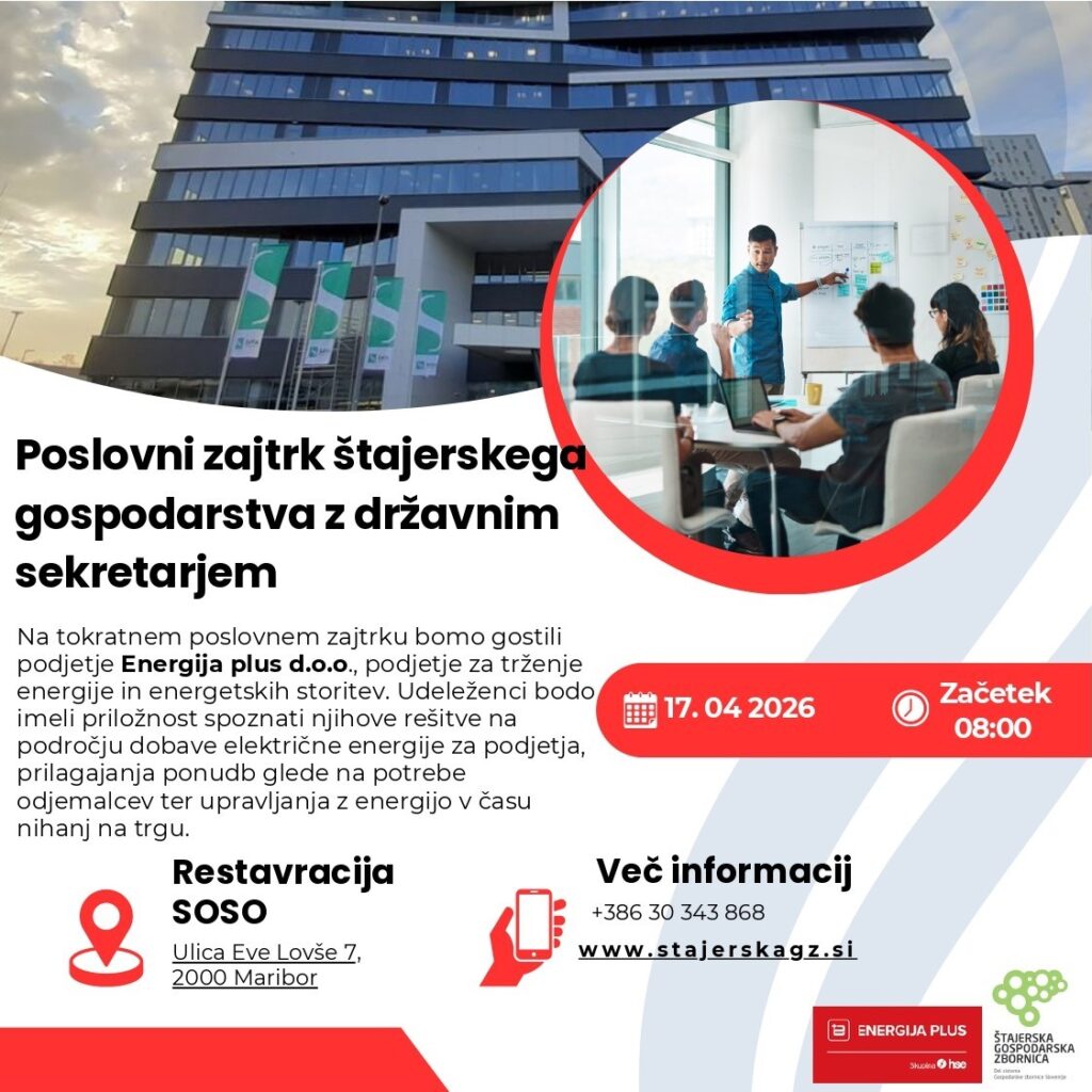 V petek, 17. aprila 2026, ob 8. uri bomo v Restavraciji SOSO (Ulica Eve Lovše 7 v Mariboru) gostili podjetje Energija plus d.o.o., podjetje za trženje energije in energetskih storitev.