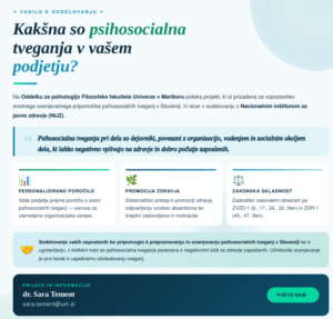 Na Oddelku za psihologijo Filozofske fakultete Univerze v Mariboru pod vodstvom dr. Sare Tement poteka projekt, ki si prizadeva za vzpostavitev enotnega ocenjevalnega pripomočka psihosocialnih tveganj v Sloveniji. Psihosocialna tveganja pri delu so dejavniki, povezani z organizacijo, vodenjem in socialnim okoljem dela, ki lahko negativno vplivajo na zdravje in dobro počutje zaposlenih. Ocenjevanje teh tveganj pa je za podjetja lahko dragoceno, saj na tak način lahko bolj sistematično pristopijo k promociji zdravja na delovnem mestu, odpravljanju vzrokov absentizma, krepitvi zadovoljstva in motivacije zaposlenih.